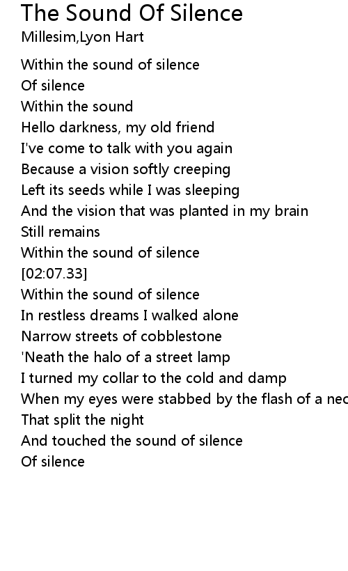 Disturbed Lyrics The Sound Of Silence originally by Simon Garfunkel Hello darkness my old friend Ive come to talk with you again Because a vision softly creeping Left its seeds while I was sleeping And the vision that was planted in my brain Still remains Within the sound of silence In restless dreams I walked alone Narrow streets of.